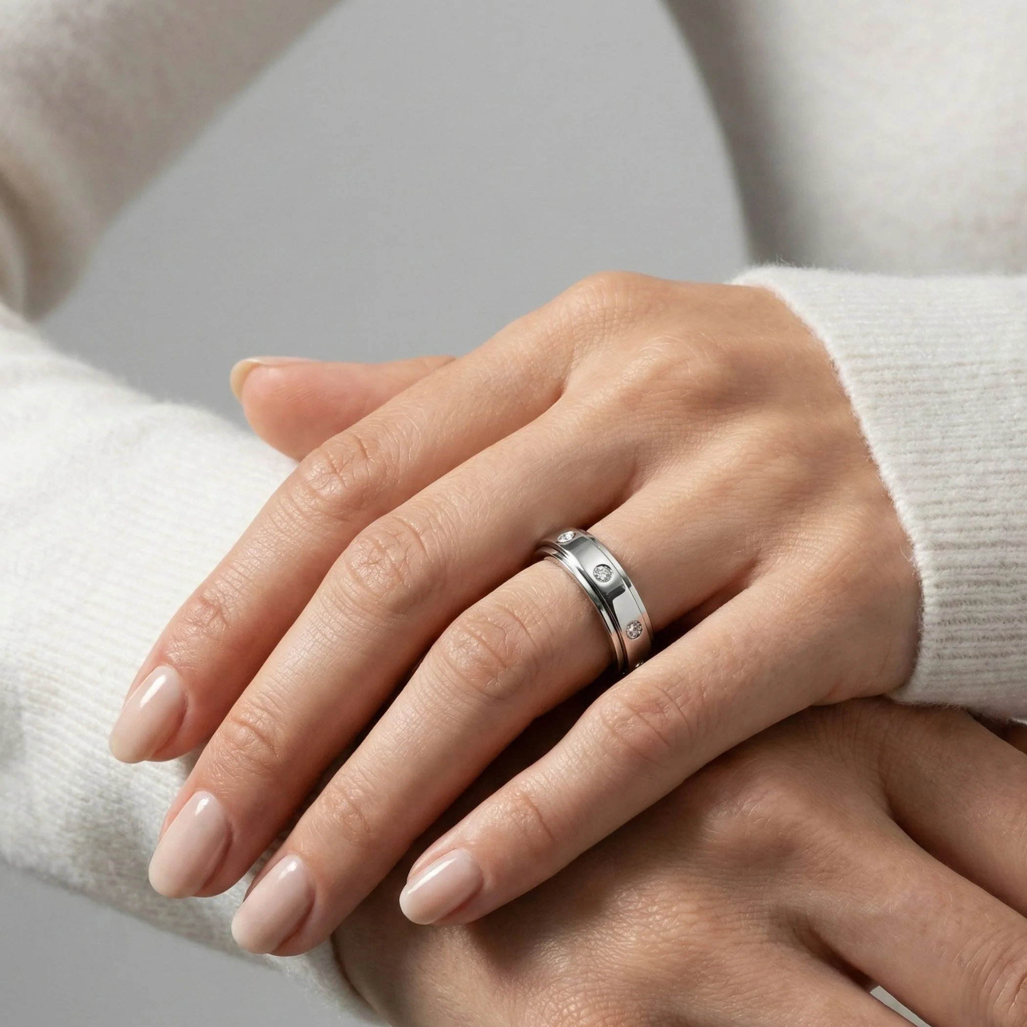 A silver spinner ring that blends modern style with calming, everyday elegance.