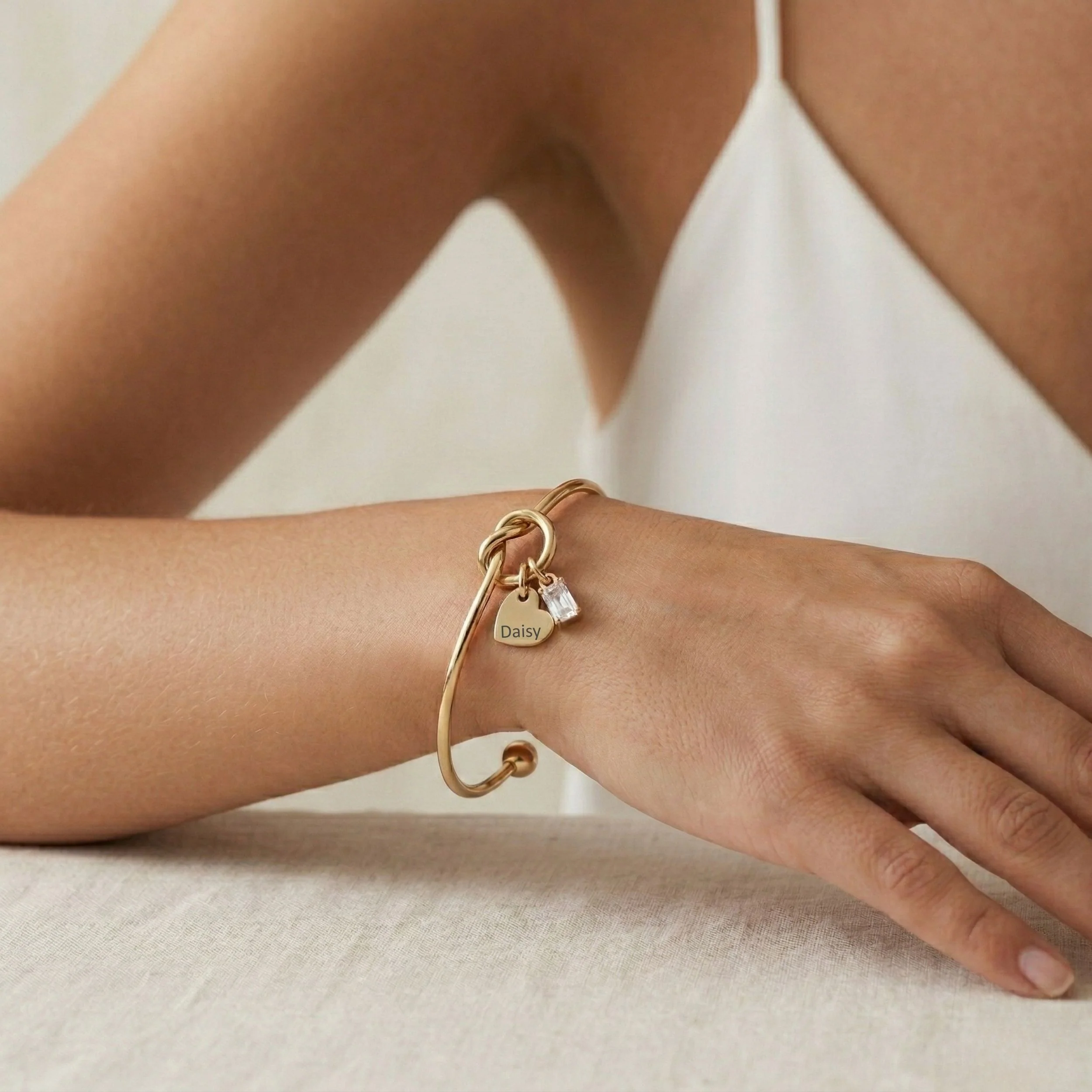 Design: Adjustable open bangle with a central knot, engravable mini heart charm and coordinating birthstone charm